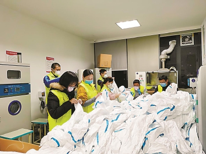 走廊里疊衣服的大姐說:“網上的視頻里,醫生戴著口罩,穿著防護服在病房走進走出,只能看到一雙眼睛,看到那眼神我就想哭。”說著,她低頭仔細把衣服折好,“前線那么辛苦,我們就多做些力所能及的。”